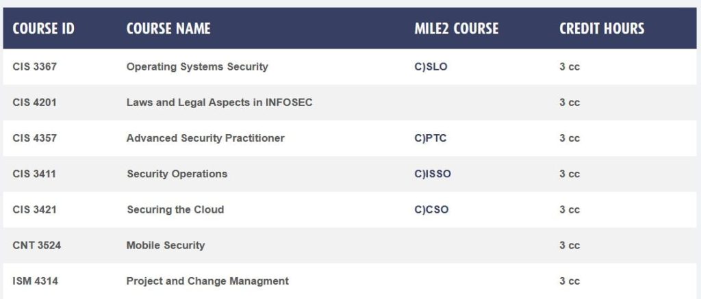 Pensacola spear-headed the first Bachelor of Applied Science Degrees using Mile2 certifications. The CYSC-BAS is built on INFOSECs most renown Mile2 cyber certifications; CDRE, CISSO, CDFE and CPTE.